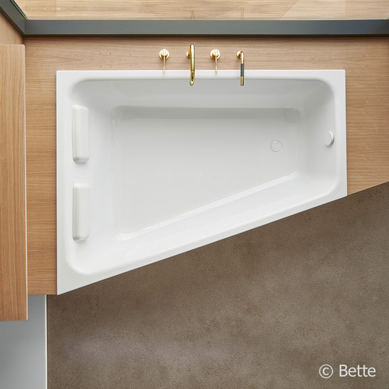 Bette-Space ist eine neue Badewannen-Kollektion aus glasiertem Titanstahl, die sich intelligent an die Raum-Architektur kleiner und mittelgroßer Bäder anpasst. Mithilfe trapezförmiger Geometrien nutzt sie den vorhandenen Raum optimal aus und bietet dabei höchsten Badekomfort. Die Grundfläche entspricht einem rechtwinkligen Trapez und spart dadurch wertvollen Raum im Bad. Jede der Wannen besitzt zudem eine breite Rückenpartie, deren Schräge für bequemen Sitzkomfort austariert wurde, und eine großzügige Liegefläche von 170 cm Länge. Je nach Vorhaben und Platz-Angebot kann zwischen 3 Varianten gewählt werden: der Raumsparwanne S, der Bade-Dusch-Kombination M und der Zweisitzerwanne L.