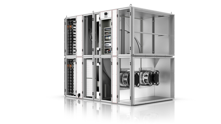 Der Einsatzbereich der CRL-Serie wird durch das Kompakt-Lüftungsgerät CRL evo max deutlich nach oben erweitert. Es ist in 4 Baugrößen mit Luftmengen von 11 000 bis 19 500 m³/h erhältlich und ab Werk mit einer weiterentwickelten, integrierten Regelung ausgestattet. Das Gerät eignet sich zur Innen- oder Außenaufstellung und ist gemäß VDI 6022 hygienisch unbedenklich einsetzbar.