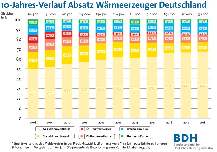 Auch 2018 gab es keine Initialzündung für die Wärmewende, beklagt der Bundesverband der Deutschen Heizungsindustrie ( BDH ) bei der Vorstellung seiner Jahresbilanz. Zwar konnten die im BDH organisierten Hersteller mit 732 000 abgesetzten Wärmeerzeugern insgesamt ein Plus von 3 % gegenüber dem Vorjahr erzielen. Dieses Plus resultiert jedoch ausschließlich aus dem nach wie vor dynamischen Neubaugeschäft.