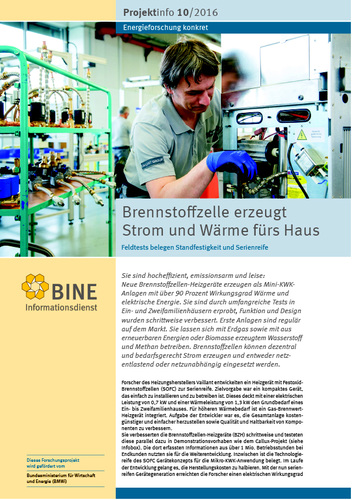 Brennstoffzellen lassen sich mit Erdgas sowie mit aus erneuerbaren Energien oder Biomasse erzeugtem Wasserstoff und Methan betreiben. Das neue Brennstoffzellen-Heizgerät ist eine Entwicklung der Vaillant GmbH in Zusammenarbeit mit Partnern aus Forschung und Industrie. Das Projektinfo gibt es in der Rubrik Publikationen unter