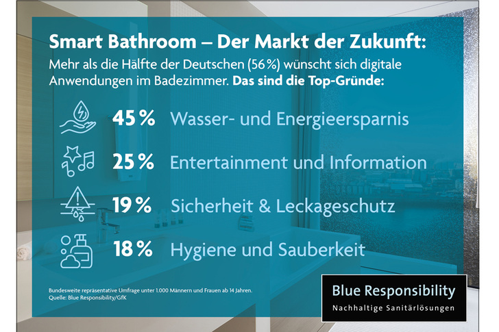 Derzeit besitzen zwar nur etwa 10 % der Deutschen Smarthome-Anwendungen im Badezimmer, jedoch können sich 56 % vorstellen, bei der nächsten Badrenovierung verstärkt digitale Produkte einzubauen. Das geht aus einer, von der Nachhaltigkeitsinitiative Blue Responsibility in Auftrag gegebenen, GfK-Umfrage hervor.
