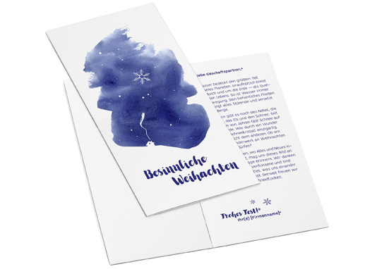 Gemäß einer Befragung unter Handwerks-Betrieben zur Weihnachts-Post sei Unternehmern ein ansprechendes Motiv besonders wichtig. Hinzu kämen ein gut platziertes Logo und der Druckservice. Diese Aspekte haben Sylke Schröder (BriefStudio) und die Grafikdesignerin Maria Gottweiss berücksichtigt, als sie ihre Weihnachtskarten-Serie „Elemente“ entwarfen. „Wasser“ und "Feuer" sind 2 von 6 Motiven.