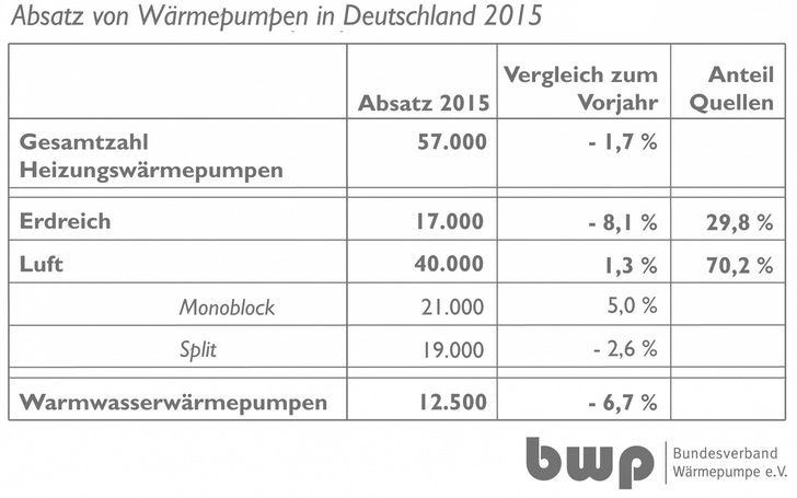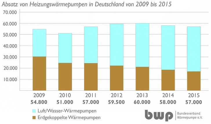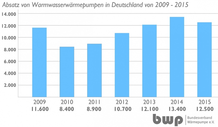 Mit 57.000 verkauften Heizungswärmepumpen in 2015 weist die gemeinsame Branchenstatistik des Bundesverbands Wärmepumpe (BWP) und des Bundesverbands der Deutschen Heizungsindustrie (BDH) ein Minus von 1,7 % (2014: –3,3 %) gegenüber dem Vorjahr mit 58.000 verkauften Geräten aus. Der Absatz der Warmwasser-Wärmepumpen war mit 12.500 Geräten erstmals seit 2010 rückläufig (–6,7 %), 2014 wurden in Deutschland 13.400 Geräte verkauft.