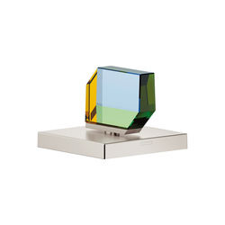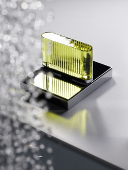 Wahlweise sind die Kristallgriffe in einer asymmetrischen Ausführung erhältlich oder mit einer filigranen Riffelung. Die asymmetrischen Griffe sind als mehrfarbige Variante verfügbar und erzeugen ausdrucksstarke Lichteffekte. In der klaren Kristallvariante vermitteln die Griffe dagegen zurückhaltende Eleganz. Einen futuristischen Akzent setzt die gelbgrüne, filigrane Riffelung, die einer textilen Materialität nachempfunden ist.