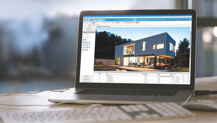 Mit " Foto-Aufmaß " von Hottgenroth/ETU lässt sich schnell und komfortabel ein Gebäudeaufmaß zur Bestimmung der Bauteilmaße von Fassaden und Dachflächen erstellen. Ein Foto mit einer Digitalkamera und einem Smartphone des Gebäudes reichen in Verbindung mit ein bzw. zwei Referenzmaßen aus. Dadurch wird das aufwändige Aufmaß vor Ort ersetzt und man kann die Maße von Wand- und Dachflächen sowie Fenstern und Türen zeitsparend am PC ermitteln.