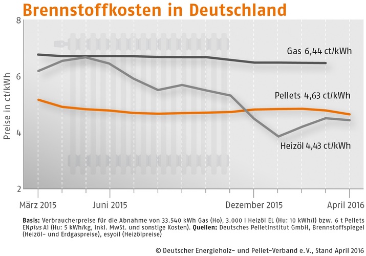 Im April 2016 kosteten Holzpellets in Süddeutschland 228,52 (Vormonat: 238,28) Euro/t, in Deutschland Mitte 230,73 (Vormonat: 237,06) Euro/t und in der Region Nord-/Ostdeutschland 241,10 (Vormonat: 245,19) Euro/t. Der DEPV-Index ist der Durchschnittspreis in Deutschland für eine Tonne Holzpellets der Qualitätsklasse ENplus A1 (Abnahme 6 t, Lieferung im Umkreis 50 km, inkl. aller Nebenkosten und MwSt.).