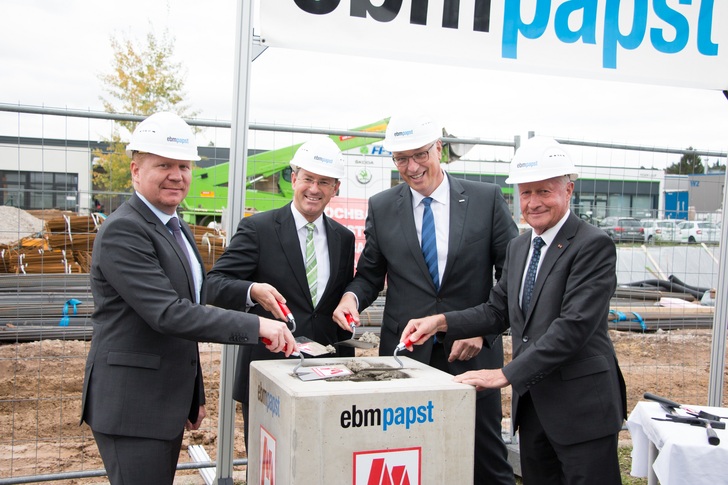 In drei Bauabschnitten entstehen nun bis Ende 2019 ein Verwaltungsbau und zwei Produktionshallen. Am Mittwoch, 11. Oktober 2017 legte ebm-papst den Grundstein für den 10.000 m² umfassenden Neubau, der bis zum Ende 2019 fertig gestellt sein soll.