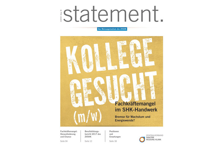 Unter dem Titel „Kollege gesucht“ hat der Zentralverband Sanitär Heizung Klima in seinem Meinungsmedium statement (Ausgabe11/2018) zum Brennpunktthema Fachkräftemangel Fakten zusammengetragen, Hintergrundinfos aufbereitet und namhafte Personen zu Wort kommen lassen.