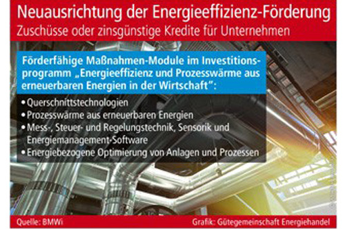 Die Energieeffizienz-Förderung für Unternehmen, die bisher auf mehrere Programme verteilt war, wird dadurch nach Angaben des Ministeriums gebündelt, vereinfacht und flexibler gestaltet. Auch dort, wo gleich mehrere Optimierungs-Maßnahmen in Angriff genommen werden, sind nun nur noch ein Konzept und ein Antrag erforderlich.