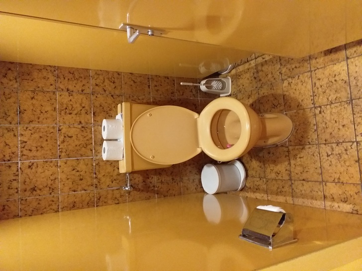 Das Gasthaus Adler in Großholzleute birgt diese alte Toilette in der Farbe Curry. Dieser ehemalige Thurn- und Taxissche-Postraum hat im Gegensatz zu dem paar Jahrzehnte alten Schmuckstück schon einige Jahrhunderte auf dem Buckel und eine bewegte Geschichte hinter sich. Zum Beispiel trug Günter Grass hier seinerzeit 2 Kapitel aus der noch unveröffentlichten Blechtrommel vor. 1987 war die englische Prinzessin Anne zu Besuch. Im Gegensatz zu den Sanitäranlagen ist die Einrichtung des Gasthauses aus dem 18. Jahrhundert.