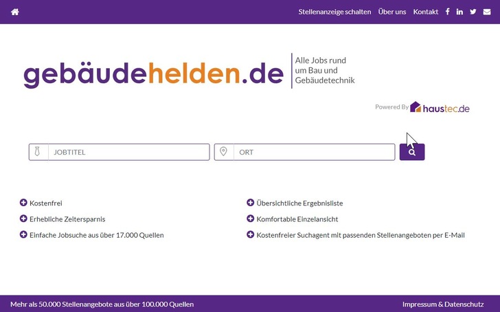 Die vom Gentner Verlag initiierte Jobbörse führt Jobsuchende und Arbeitgeber aus dem Segment Gebäudetechnik an einer Stelle zusammen. Und das gibt es auf dem deutschen Stellenmarkt für Gebäudetechniker kein zweites Mal: Wer Gebäudehelden.de anklickt, hat Zugriff auf praktisch alle aktuellen Jobs, die die Branche deutschlandweit zu bieten hat.