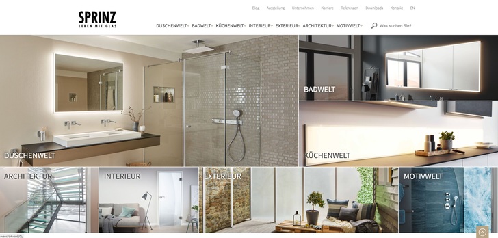 Die Rubrik Duschenwelt stellt Echtglas-Duschen, Glasrückwände und Sonderprodukte aus Glas vor. Die Badwelt zeigt weitere Produkte für das Badezimmer wie Flächenspiegel, Spiegelschränke und Badmöbel. Weiter bietet die Sprinz-Website eine praktische Händlersuche sowie aktuelle Kataloge zum Download.