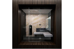 Funktionale Ausstattung ist erst auf den 2. Blick erkennbar, da sie in ausgeklügelten Konzepten in der Wand verschwindet. Bestes Beispiel ist das Dampfbad: Erst in Funktion offenbart es die komplette Wellness-Ausstattung. Die mit Marmor verkleideten Wände der Dampfdusche sind individuell auf das Badezimmer zugeschnitten.