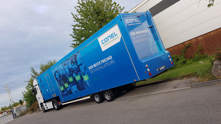 Conel ist auf Deutschland-Tour. Ein dunkelblauer und mit dem Conel-Slogan „Der beste Freund des Installateurs“ versehener Showtruck feierte am 12. Juli 2019 beim Großhandelshaus Gienger in Kornwestheim Premiere und fährt seither zu Veranstaltungen durch die ganze Republik.
