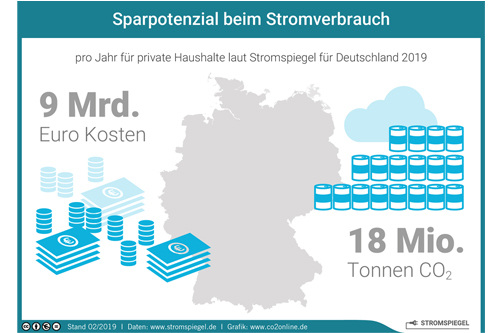 Laut Auswertung von rund 226 000 Daten von Privathaushalten stagniert der Stromverbrauch im Vergleich zu den Vorjahren. Hochgerechnet auf ganz Deutschland verschwenden private Haushalte jährlich 9 Mrd. Euro und sind für unnötige Emissionen von fast 18 Mio. Tonnen CO 2 verantwortlich. Damit sind die Ziele für Energiewende und Klimaschutz in Gefahr. Welchen Beitrag die privaten Haushalte leisten könnten, macht ein Vergleich deutlich: Die vermeidbaren CO 2 -Emissionen entsprechen etwa denen des Braunkohle-Kraftwerks Weisweiler, das zu den 5 klimaschädlichsten Kraftwerken in Europa zählt.