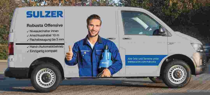 Sulzer stellt mit dem „Robusta-Mobil“ seine Schmutzwasserpumpen bundesweit beim Sanitär- und Heizungsgroßhandel vor. Die Kleinpumpen der Serie Robusta sind für Klar-, Schmutz- und Regenwasser geeignet, das auch leicht aggressiv verunreinigt sein darf.