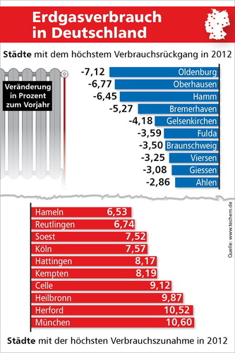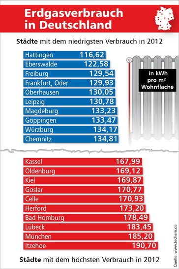 Abhängig von Witterung, Nutzerverhalten und Gebäudesubstanz gibt es regional große Unterschiede im Energieverbrauch. Besonders hohe Verbräuche (gemessen an Erdgas in kWh/m2) zeigte die Techem Energiekennwerte-Studie für 2012 in Itzehoe, München und Lübeck. Besonders niedrig war der Verbrauch in Hattingen, Eberswalde und Freiburg. Bemerkenswert sind auch die Unterschiede bei der Veränderung des Energieverbrauchs gegenüber dem Vorjahr. Deutlich mehr verbrauchten die Bewohner von Mehrfamilienhäusern in München, Herford und Heilbronn mit rund 10% Zuwachs. Den stärksten Rückgang verzeichneten die Oldenburger sowie die Einwohner von Oberhausen und Hamm mit rund 6,5 bis 7% niedrigerem Verbrauch.