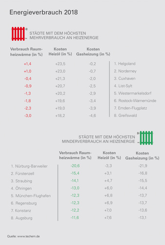 Aufgrund des im Vergleich zum Vorjahr um 7,4 % wärmeren Kalenderjahres 2018 ist der Verbrauch von Raumheizwärme in fast allen Regionen in Deutschland zurückgegangen. Das belegen Auswertungen des Energie-Dienstleisters Techem. Trotzdem müssen Mieter, die mit Öl heizen, vorraussichtlich nachzahlen. Der Grund dafür ist der deutlich gestiegene Ölpreis (2018 gegenüber 2017: +21,8 %). Die Raumheizkosten in ölversorgten Liegenschaften könnten sich damit im Bundesdurchschnitt voraussichtlich um 12,8 % erhöhen.