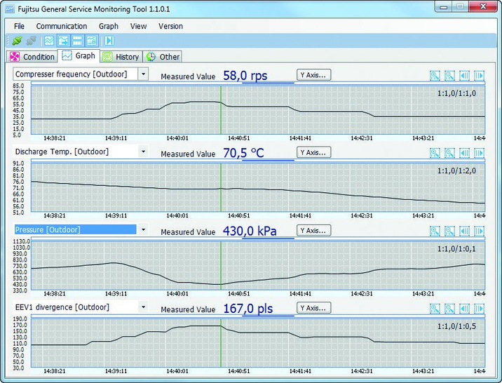 Durch einen Konverter verbindet man seinen PC mit dem Fujitsu-Klimaaußengerät und bekommt alle relevanten Messdaten übersichtlich angezeigt. Die grafische Darstellung sämtlicher Betriebszustände wird in einer Übersichtsmaske mit 4 Feldern angezeigt. Den Inhalt der Felder bestimmen Sie selber. Sie wählen also aus, was Sie angezeigt bekommen möchten. Somit sind Informationen wie Lüfter- und Verdichterdrehzahl, sämtliche Temperatursensoren, Öffnungsgrad der elektronischen Einspritzventile, Spannungshöhe, Stromaufnahme und Fehlercodeanzeige auf einen Blick zu erkennen. Sobald das Service Monitoring Tool mit einer Anlage verbunden ist und gestartet wird, beginnt die Software mit der Aufzeichnung und Speicherung der Anlagendaten. Diese sind auch später noch vom Büro aus bequem auswertbar. Die mit Uhrzeit und Datum versehenen Anlagendaten ermöglichen eine schnelle und sichere Fehlerdiagnose.