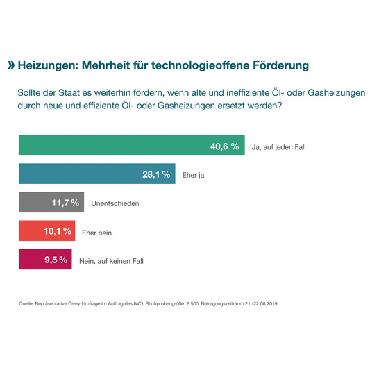 "Die Ergebnisse der aktuellen Umfrage zeigen, dass technologieoffene Anreize den Bedingungen im Gebäudebestand am ehesten entsprechen", erklärt Adrian Willig, Geschäftsführer des Instituts für Wärme und Oeltechnik (IWO). "Die sofortige Einrichtung einer 100-prozentig erneuerbaren Wärmeversorgung ist vor allem in sehr vielen älteren Häusern technisch gar nicht machbar. Studien zeigen zudem, dass wir die Klimaziele mit einem breitgefächerten Technologiemix sicherer und günstiger erreichen können." Wichtig seien dabei schnelle und nachhaltige Effizienzsteigerungen.