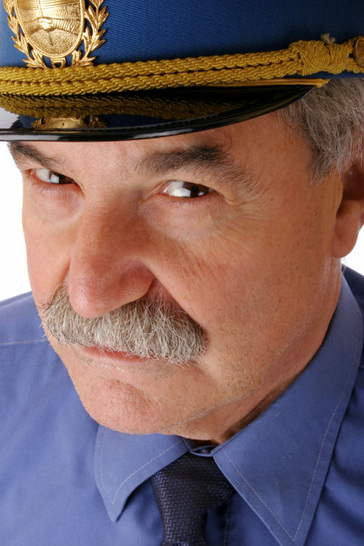 Der Polizist hält ein Fahrzeug an und streckt den Kopf in das heruntergelassene Fenster des Wagens: „Verbandskasten, Warndreieck!“
