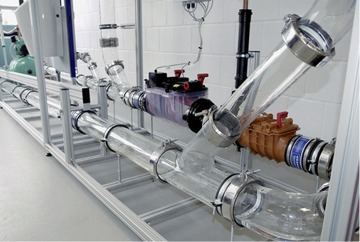 Während der offiziellen Inbetriebnahme sorgte die 5 x 4 m große Demonstrationsanlage im Kompetenzzentrum der Kölner SHK-Innung für allgemeines Erstaunen unter den Zuschauern. Denn was sonst stets im Verborgenen abläuft (oder eben auch nicht) und sich in der Gebäudeinstallation allenfalls durch Gluckern, Gurgelgeräusche oder einen Stau zu erkennen gibt, lässt sich durch die gläsernen Leitungen nachverfolgen. Solche Bilder sind erheblich einprägsamer als graue Theorie. Aus Fehlern lässt sich lernen.