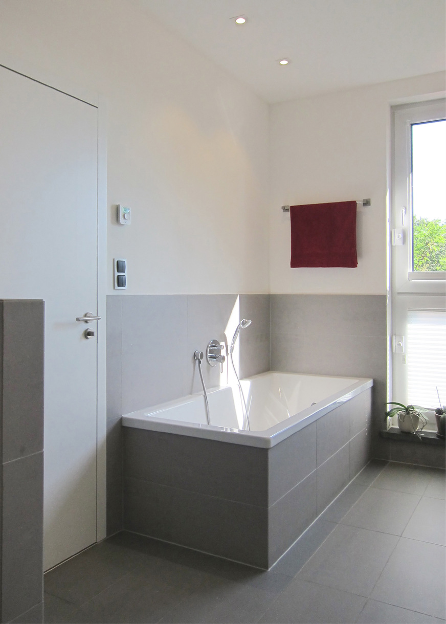 Im linken Teil des Raumes liegen sich Wanne und Waschtischanlage gegenüber. Die Wanne hat einen Mittelablauf, so ist die Sitzposition wählbar – entweder mit Blick aus dem Fenster ins Grüne oder am Abend in den Raum hinein. Plissees an den Fenstern verhindern dann den Einblick von außen. Eine Handbrause erleichtert die Reinigung der Wanne.