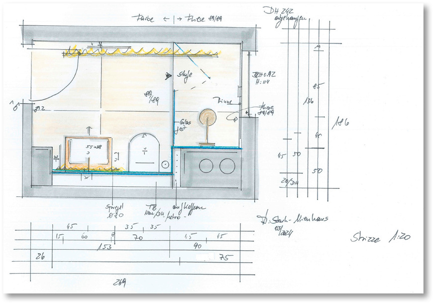 Auch dieses Konzept kam so nicht in die Umsetzung. Aber die Farbe Blau war nun im Kopf der Bauherrin und wurde als Wandfarbe festgehalten. Es ist immer wieder spannend und wunderschön, mit den Bauherren gemeinsam diesen Weg zu beschreiten. Wichtig ist es dabei, genau hinzuhören, auch die Untertöne zu erspüren und im richtigen Moment daran zu erinnern. Manche Menschen werden auf dem Weg auch mutiger.