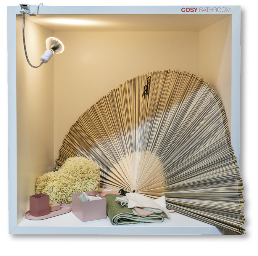 Im Cosy Bath wird Gemütlichkeit großgeschrieben. Organisches Design bei Armaturen, Badmöbeln und weiteren Sanitärprodukten entschärft scharfe Kanten und Ecken. Die Farbpalette aus Beige und Karamell schafft eine warme, einladende Atmosphäre. Leinenstoffe und helle Furniere verleihen dem Raum ein sehr natürliches, leicht gediegenes Flair. Weiche Kissen, tiefe Teppiche und Accessoires aus Holz schaffen eine behagliche Umgebung. Eine Bank mit geflochtener Sitzfläche oder mit Kissen rundet das Ambiente ab, und das Badezimmer wird zu einem Ort der Entspannung und Geborgenheit.