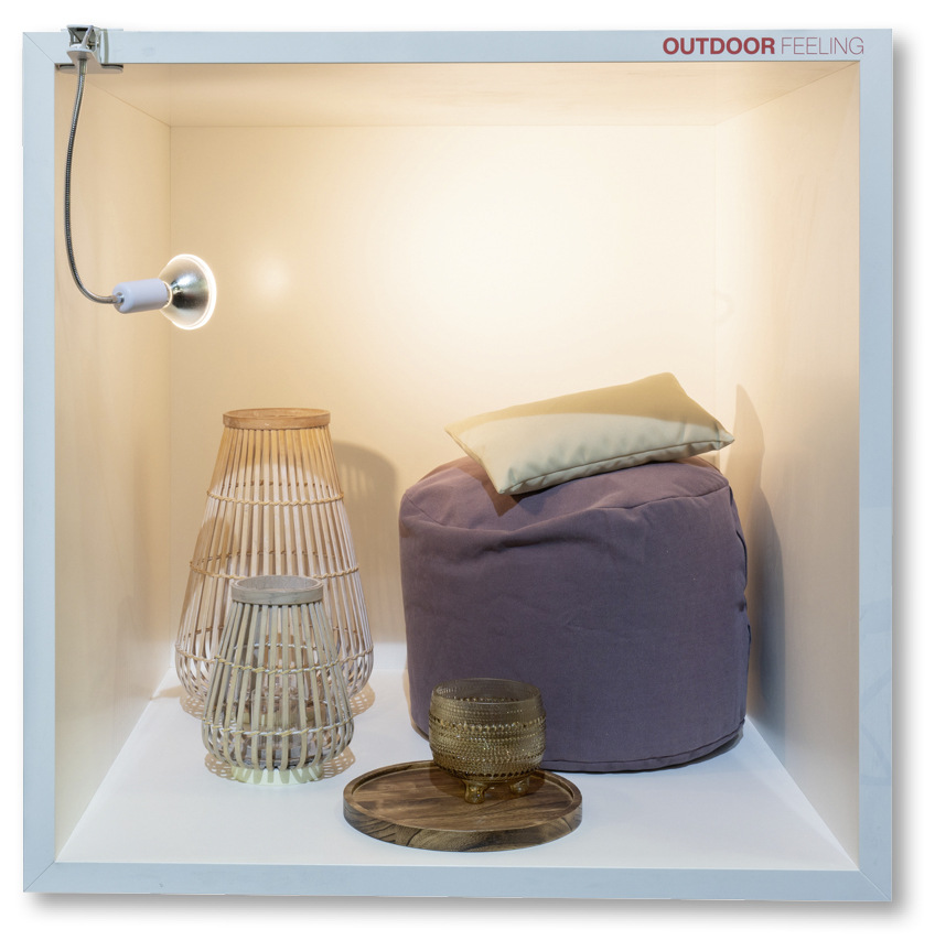 Im Outdoor-Feeling-Badezimmer wird der tägliche Aufenthalt zu einem naturnahen Erlebnis. Ein Teppich aus Holz und Geflecht vermittelt Erdverbundenheit. LED-Lampen mit Akku zaubern eine stimmungsvolle Atmosphäre wie auf der Terrasse. Fröhlich gefärbte Sitzkissen laden zum Verweilen ein. Auf einem Holztisch entsteht mit frischem Obst und Saftgläsern ein sommerliches Ambiente. Wem das noch nicht reicht, der ergänzt das Outdoor-Feeling durch Pflanzen und eine Lampion-Kette. Die Tür zum Garten lässt den Morgentau spüren. Dieses Badezimmer schafft eine Verbindung zwischen drinnen und draußen, ein Ort der Ruhe und Naturverbundenheit.