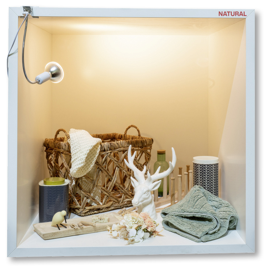 Im Natural-Badezimmer entfaltet sich eine skandinavische Oase der Einfachheit. Eichenmöbel und einfache Möbelformen wie eine Bank wirken sehr natürlich. Weiße Riffelvasen schaffen mit Gräsern und Eukalyptus bestückt eine meeresfrische Szenerie, und ein Bild aus Moos und Filz symbolisiert die Verschmelzung von Badkultur und Natur. Baumwoll- und Wolltextilien oder Teppiche aus Sisal sorgen für einen natürlichen Komfort. Korbgeflechtlampen und eine Korkdekoration unterstreichen die organische Ästhetik. Wer mag, konterkariert das Natur- oder Scandistyle-Klischee mit fein dosierten Zitaten und Übertreibungen wie Hirschgeweih oder Kunstfell. Dieses Badezimmer ist eine Huldigung an die Schönheit natürlicher Materialien und die Gelassenheit skandinavischen Designs.