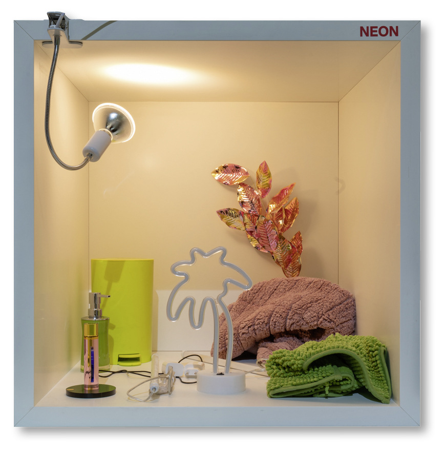 Dieses emotionale Badezimmer vereint Modernität mit Retro-Charme, inspiriert von den kühnen Designs der 70er und den poppigen Farben der 80er. Acrylglas, Kunststoff und Metall schaffen eine modern interpretierte nostalgische Atmosphäre. Bunte Glasvasen und Gläser setzen fröhliche Akzente, während runde Formen, ein kreisrunder Spiegel und Plüsch den Style bestimmen. Neonfarben in Gelb und Orange oder Lila und Orange verleihen dem Ambiente einen lebendigen Touch. Eine Lavalampe und ein Utensilo von Vitra fügen verspielte Details hinzu. Philips Hue ermöglicht farbenfrohe Lichtstimmungen, während bunt bemalte Holzmöbel und Vintage-Accessoires für einen charmanten Mix sorgen. Setzkästen mit neonfarbener LED-Innenbeleuchtung komplettieren das einmalige, lebendige Erlebnis dieses Badezimmers.