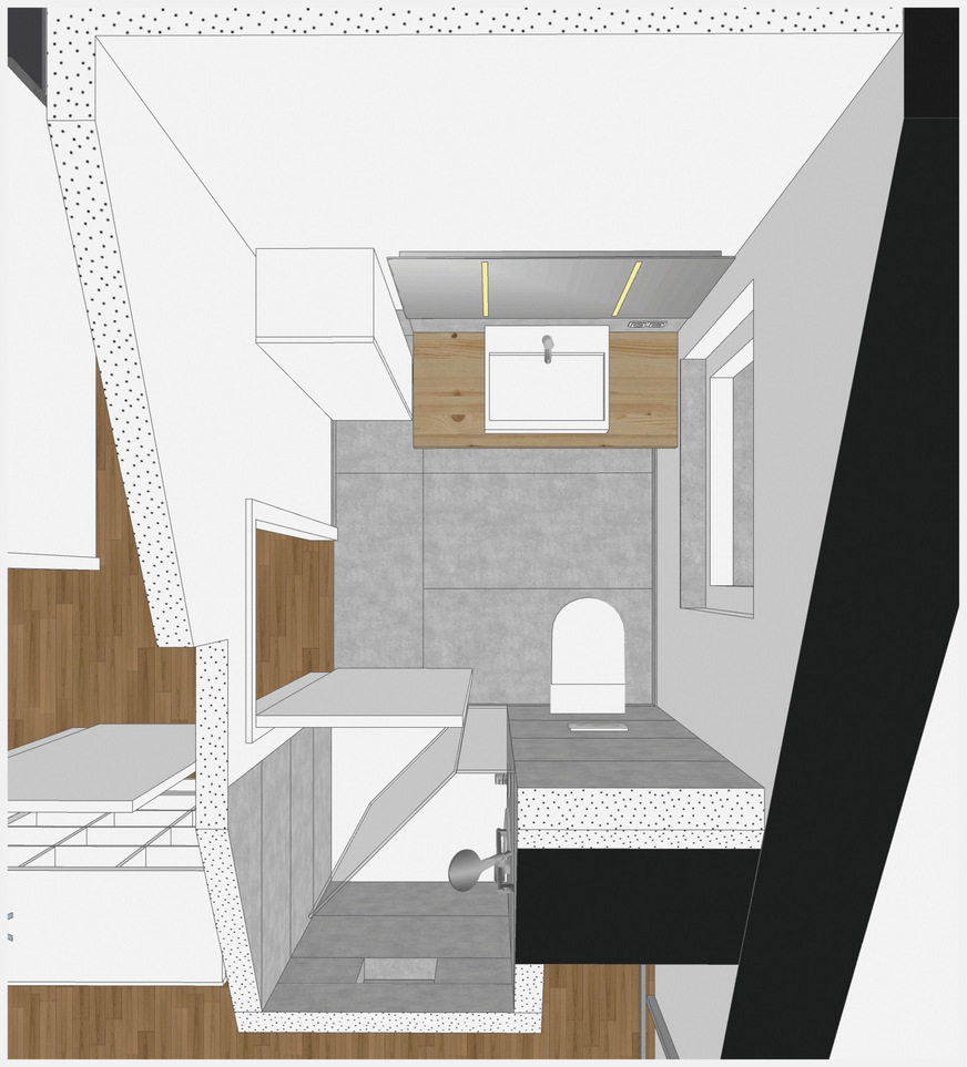 Das Parkett im Dachgeschoss war in gutem Zustand und wurde im Zuge des Umbaus aufgearbeitet. Lediglich im Bereich des Bades musste der Belag entfernt werden. Für das WC ließen wir eine raumhohe Vorwand vor den Schacht stellen. Hier wäre der Einbau einer Dekonische möglich gewesen, aus Kostengründen wurde aber darauf verzichtet. Die Duschfläche ist neben dem Schacht als Nische so weit in die Schräge geschoben, dass die Kopfhöhe noch gegeben ist. Ihre Größe von 90 x 90 cm ist völlig ausreichend für komfortables Duschen.