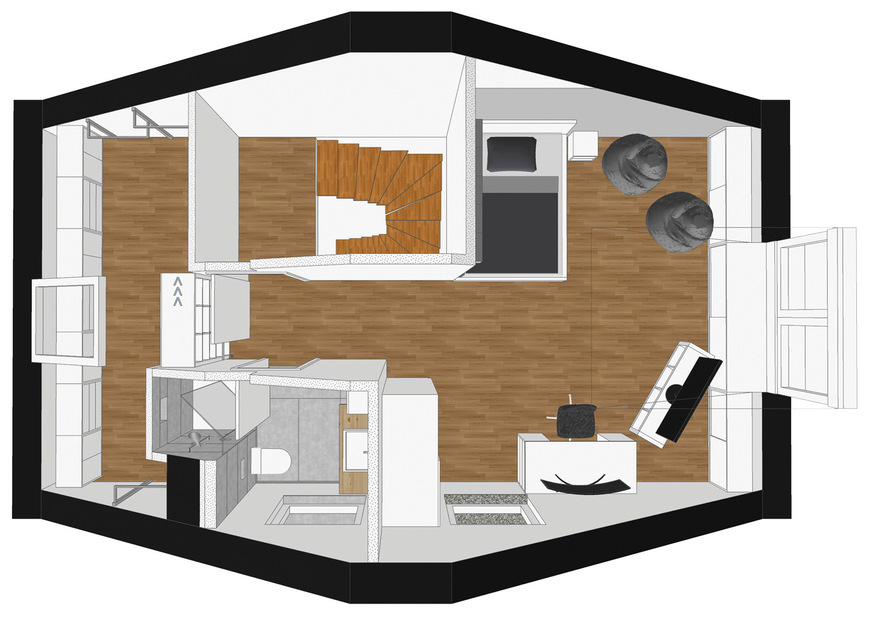 Die Lage des Bades am Schacht war weitgehend vorgegeben. Wir planten den Raum also auf kleiner Fläche und unter Ausnutzung der Schräge. Eines der beiden Fenster in der Giebelwand schlugen wir dem Bad zu. Das löste bei den Kunden Befürchtungen aus, dass der große Raum dadurch zu dunkel werden würde. In einem Gespräch konnte ich die Bedenken aber zerstreuen. Denn diese Lösung hat gleich zwei Vorteile: Das Bad hat Tageslicht und es lässt sich gut lüften. Und durch das zweite Fenster in der Giebelwand und das Fenster in der Gaube fällt nach wie vor viel Licht in den Raum. Durch die Wand des Bades entsteht ein kleiner offener Flurbereich vor dem eigentlichen Raum.