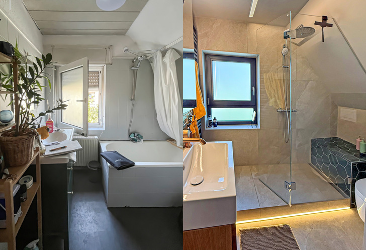 2 Badewannen können bis auf 100 cm Höhe in die Schräge geschoben werden. Das reicht aus, um Kopffreiheit zu gewährleisten. Aber den Bereich des Einstiegs bitte wieder bei mindestens 200 cm vorsehen. Manchmal hilft dabei ein Dachschrägenfenster.