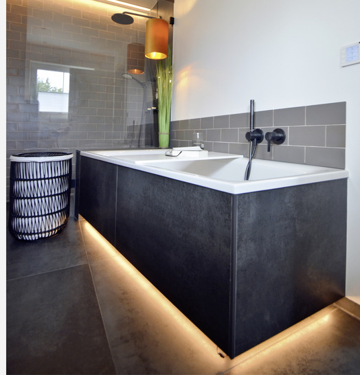 Die anthrazitfarbene, metallisch anmutende Bodenfliese bekleidet in der gesamten Breite die Kopfseite der Dusche. Die Unterputzarmaturen in Anthrazit versinken in der Wand und stärken die Optik der beleuchteten Nische. Mit einer angepassten Glaswand wird der Bereich zur Badewanne hin getrennt.