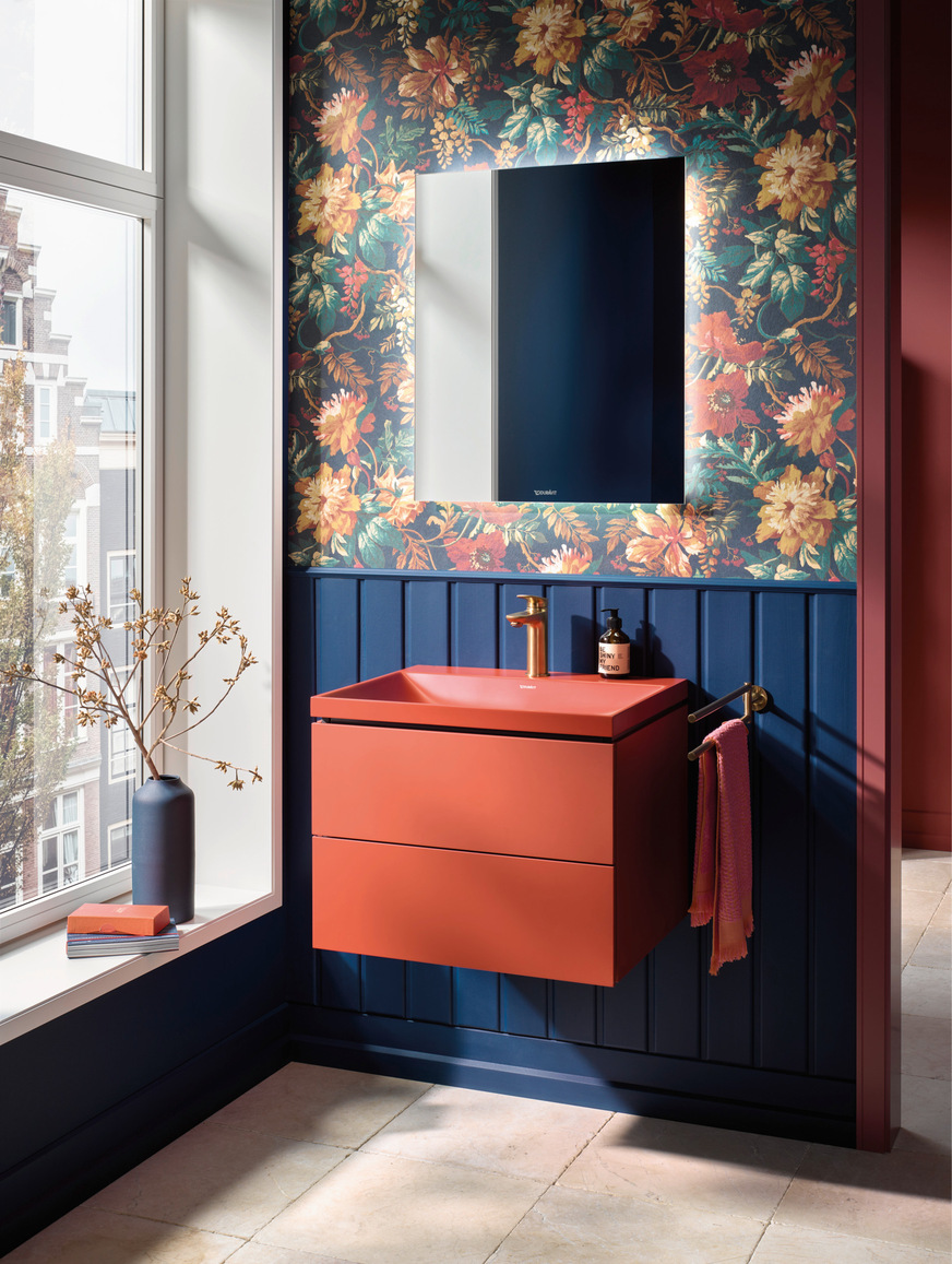 Orange: ist fruchtig, aktiv und steht für Lebensfreude. In ihrer reinsten Form wird die Farbe als lebensbejahend und fröhlich eingestuft. Orangefarbene Handtücher, eine braune Wand und blonde Hölzer machen selbst ein dunkles Bad warm, sonnig und gemütlich. Als Akzent dazu: gern schwarze Armaturen in matt. Stilistische Anleihen aus den 1970er- und 1980er-Jahren sind ebenfalls passend.