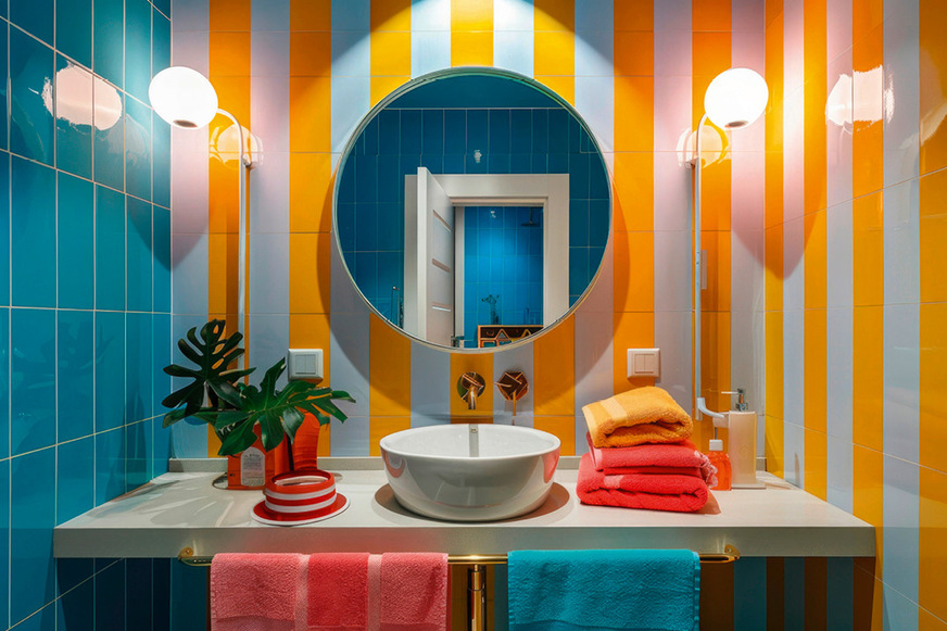 Kräftige helle Farben und spielerische Muster können die Dopaminausschüttung stimulieren, auch und gerade im Bad. Diese Nuancen werden mit positiven Emotionen wie Glück, Freude und Zufriedenheit assoziiert. Sie können ein wenig Frohsinn in den Alltag bringen und helfen, unsere Motivation zu verbessern. Jedoch gilt: Überdosis vermeiden!