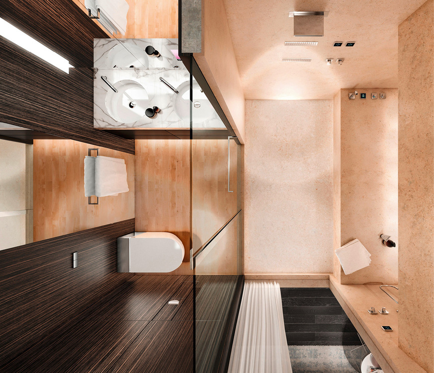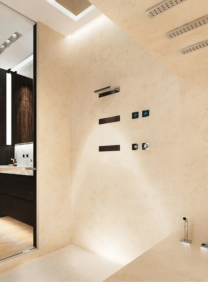 Eine durchdachte Zonenarchitektur ist die Basis des SSPS. Das Raumkonzept ist in zwei klar gegliederte Bereiche unterteilt: die Nasszone und die Trockenzone. Beide sind durch eine Glaswand getrennt. Oder besser formuliert: miteinander verbunden. In die Nasszone wurden zahlreiche Funktionen integriert, die man oft nur aus großen Spa-Bereichen kennt. Neben einer vertikalen Dusche gehört dazu auch eine horizontale zur Nutzung im Liegen oder ein Gießrohr mit laminarem Strahl für regenerative Teilkörperanwendungen. Eine klassische Badewanne kann bei Bedarf – zum Beispiel gemeinsam mit einem Fußbad – integriert und abgedeckt als Sitzbank genutzt werden. Wichtig war uns, dass dieser Bereich für zwei Personen ausgelegt ist, unter anderem auch als Dampfbad. Und mit Regenpaneelen in der Decke wird das Duschen zu einem Erlebnis: Das Wasser fällt sanft wie ein Sommerregen oder belebt mit verschiedenen Strahlarten, auch im Zusammenspiel mit Nebeldüsen und stimmungsvoller Ambientebeleuchtung.