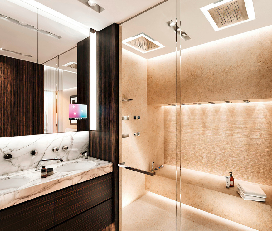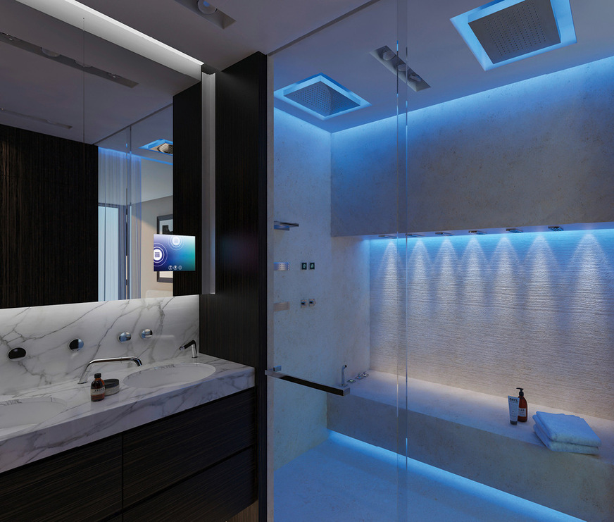 Seit den 1980er-Jahren, als aus der einstigen Nasszelle ein gestaltetes Bad und immer mehr ein echter Lebensraum wurde, wissen wir: Es braucht nicht nur maximale Funktionalität, sondern Atmosphäre, um einen Rückzugsort, eine Wohlfühloase für verfeinerte Badrituale zu schaffen. Deshalb spielt das Lichtkonzept im SSPS eine zentrale Rolle, insbesondere für fensterlose Bäder. Integrierte LED-Lichtleisten und Spots kreieren je nach Befinden die passende Stimmung, um das Wohlbefinden zu steigern.