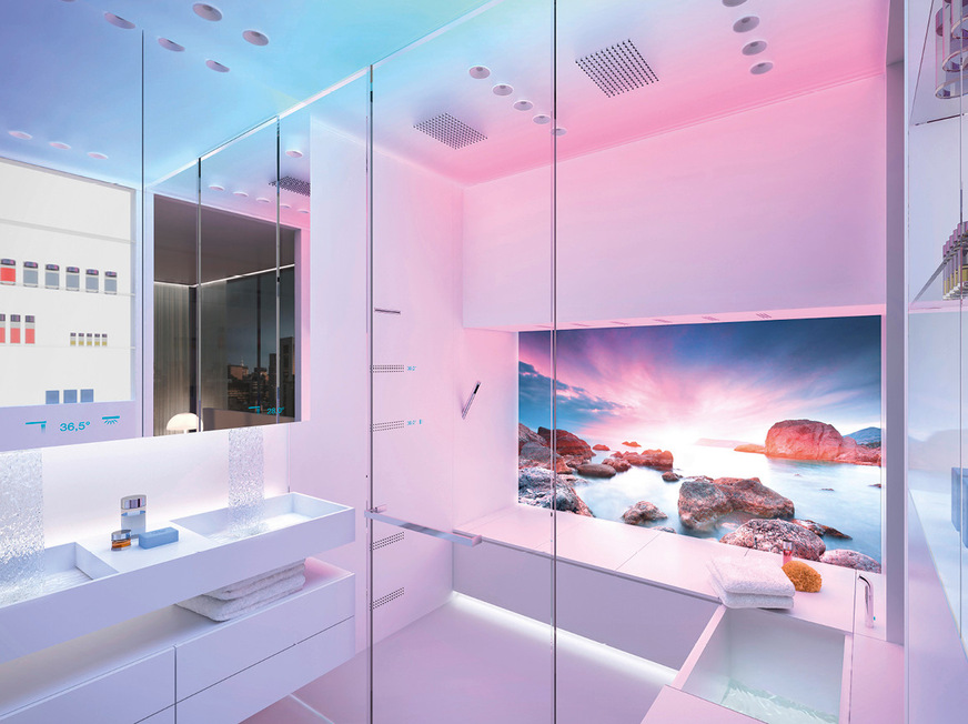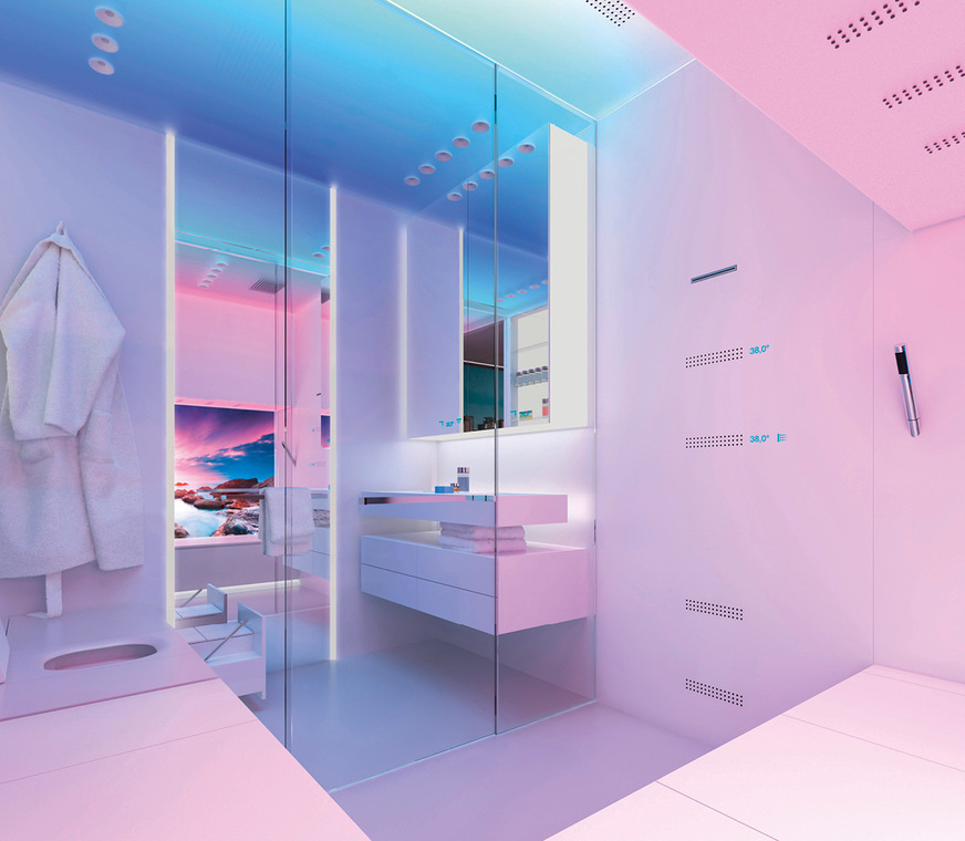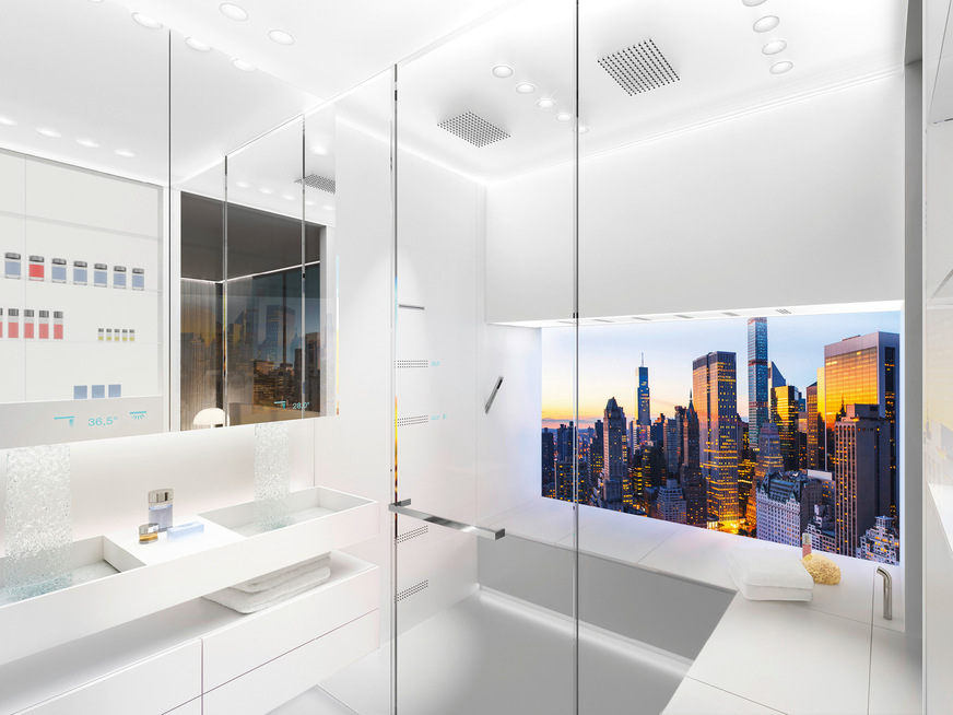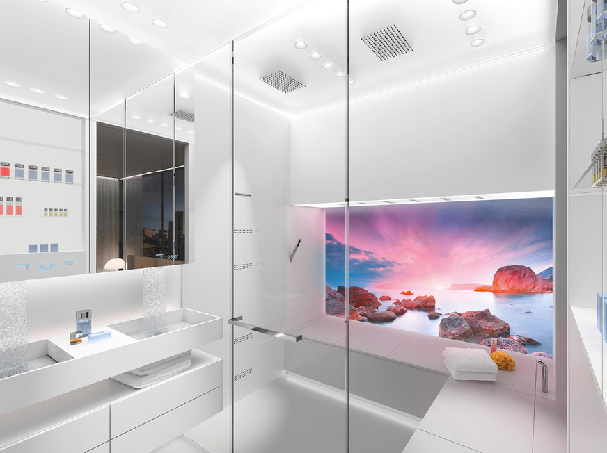 In unserer SSPS-Interpretation „Broadening Horizons“ haben wir dies noch einen Schritt weitergedacht. Hier fungiert ein großzügiger Bildschirm als virtuelles Fenster, das über eine Außenkamera Livebilder überträgt, inklusive des natürlichen Lichtverlaufs. Das wirkt sich positiv auf unseren zirkadianen Rhythmus aus – und damit auf unsere innere Balance. Darüber hinaus schließen vorprogrammierte Szenarien weitere Elemente wie Duft und Sound und sogar die gesamte Raumarchitektur ein. Die planen Flächen des Bads werden in dieser Interpretation zu einer intelligenten Architektur. Sie dienen als Leinwand für individuelle Szenarien wie einem belebenden Regenschauer.