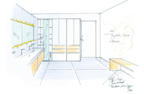 Der großzügig bemessene Raum für das Masterbad wird neu konzipiert. Eine eingestellte Trockenbauwand präsentiert den Waschplatz auf den ersten Blick in den Raum. Sie ist in L-Form ausgebildet, um den Zugang auf 120 cm zu begrenzen, die breite, schwebende Sitzbank zu halten und auf der kurzen Seite den elektrisch betriebenen Badheizkörper an der richtigen Stelle positionieren zu können. Über der Möbelanlage bietet der Einbauspiegelschrank neben Stauraum auch perfektes Funktionslicht, das von dem beleuchteten Kosmetikspiegel abgerundet wird.