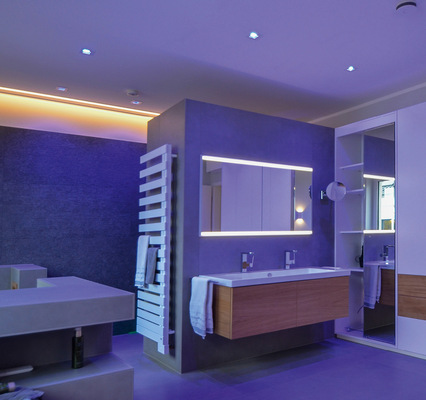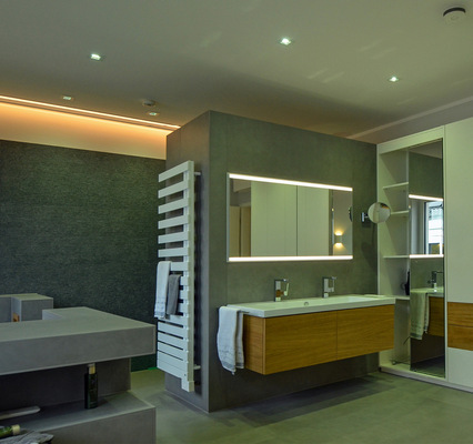 Die abgesenkte Vorwandschale im vorderen Bereich bietet Abstellfläche, der Unterschank Stauraum und die auf die gesamte Breite angepasste Spiegelfläche übernimmt die optische Raumvergrößerung. Das Up-down-Licht über dem Spiegel reicht für den täglichen Bedarf sicherlich aus, dennoch kann zusätzliches Licht über die Deckenspots zugeschaltet werden. Diese sind dimmbar und verfügen über einen hervorragenden Farbwiedergabewert.