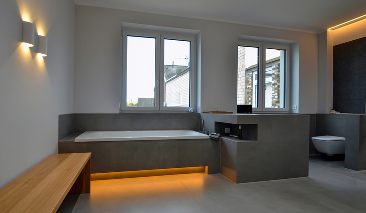 WC und Bidet verstecken sich hinter abgesenkten Vorwänden im hinteren Bereich. Die Höhe der Vorwände ist auf die Brüstungshöhe der Fenster abgestimmt und gibt die Höhe der Fliesenverlegung auf der Fensterseite an. Die Badewanne besticht durch den beleuchteten Untertritt und schmiegt sich für ein entspanntes Badevergnügen an den Mittelblock an.