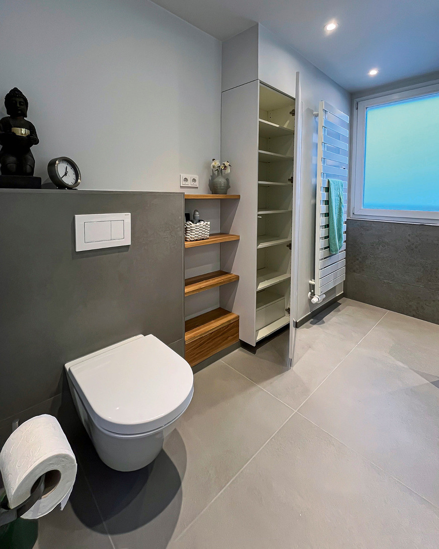 Die auffallend große Ecke, die durch den Deckenkasten entsteht, wird durch einen angepassten Hochschrank gefüllt. In der Tiefe des Schachtes, bis zur Fußleiste heruntergezogen, bietet er (mit Regalböden ausgestattet) sehr viel Stauraum. Der Clou daran ist, dass er in der Wandfarbe lichtgrau matt lackiert ist und damit fast unsichtbar wird. Praktischer Stauraum verbunden mit absoluter Raumharmonisierung entsteht, denn die störende Eckenkonstruktion ist optisch verschwunden. Regalböden in Eiche Natur verbinden die entstandene Lücke bis zur Vorwandschale des Wand-WCs. Der untere Boden wird als Winkel ausgearbeitet, um den Rohrkanal zu verkleiden. Möbel sind eben „Hidden Champions“, wenn sie praktischen Nutzen mit optischen Raffinessen kombinieren und ein ausgeklügeltes Raumkonzept vervollständigen. Entweder optisch dominant oder eben in der Raumgestaltung aufgehend – ganz nach Bedarf.