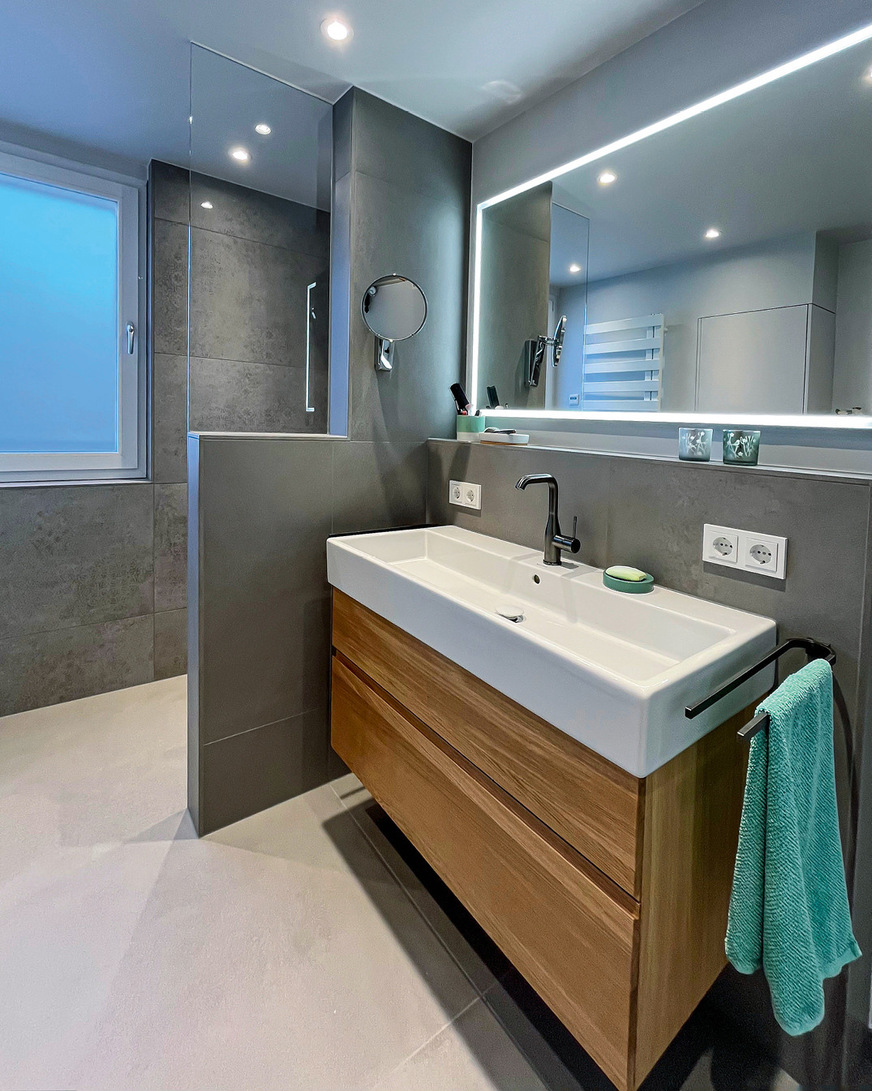 Das Bad in einem Einfamilienhaus soll erneuert werden. Gewünscht wird ein harmonisches, modernes Gesamtkonzept in Grauschattierungen mit warmen Akzenten, gutem Licht und viel Komfort. Ausreichend Stauraum für drei Personen, Dusche statt Badewanne und Fußbodenheizung erweitern den Wunschzettel. Hinter der vorhandenen Wandscheibe ist ungenutzter Raum in 90 cm Breite vorhanden. Eigentlich hätte hier einfach eine quadratische Dusche das Bad vervollständigen können. Aber da durch den Wegfall der Badewanne ausreichend Platz im Raum zur Verfügung steht, wird die gesamte Kopfseite des Raumes als offene Duschzone deklariert. Die Wandscheibe hätte mit einer schmalen, durchgehenden Glasscheibe verlängert werden können, um ausreichend Spritzschutz zu generieren. Doch auf Kundenwunsch wird der untere Teil bis 120 cm aufgemauert und nur darüber mit Glas geschlossen. Das ergibt zwar weniger Transparenz, ist aber wesentlich pflegeleichter.
