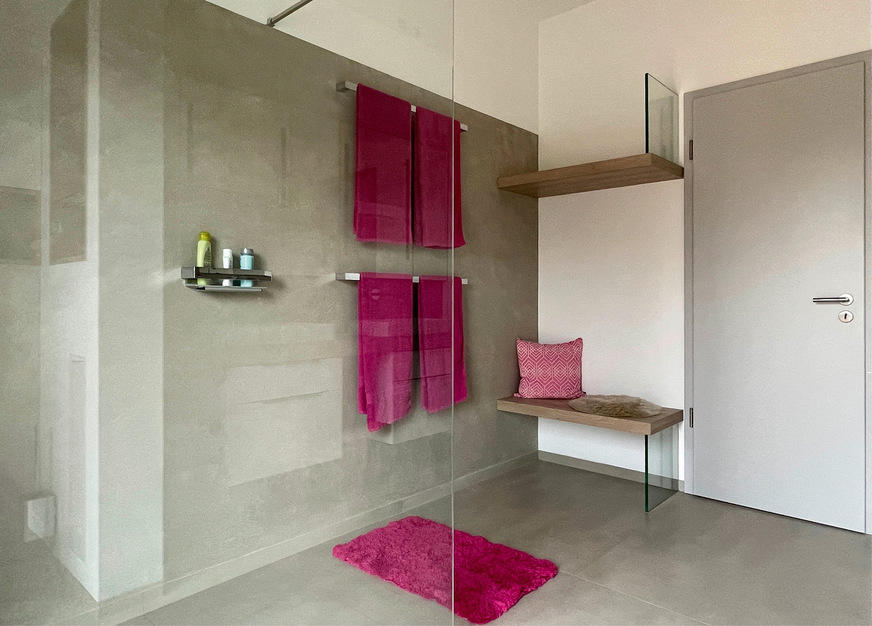 Die Kunden wünschten sich einen möglichst durchgehenden, fugenlosen Look für alle Flächen. Daher entschieden sie sich – anstelle von Fliesen – für eine Spachteltechnik an den Wänden. Am Boden wurden Fliesen im Format 120 x 120 cm verlegt. Dank der schmalen, farbgleichen Fugen wirkt die Fläche fast ebenso durchgehend wie die Wände. Fliesen und Spachteltechnik sind farblich perfekt aufeinander abgestimmt, auch die wolkige Optik der Wände findet sich in den Fliesen wieder. Die Sockelfliesen sind flächenbündig in die Wände eingelassen, sodass auch hier die Materialien fast nahtlos ineinander übergehen. Die sehr authentisch wirkende Holzoptik der Ablagen und Regale fügt sich perfekt in die natürliche, zurückhaltende Farbgebung ein. Sie gibt den Nutzern die Möglichkeit, das Bad mit farbigen Handtüchern und dazu passenden Blumen aus dem Garten immer wieder neu zu gestalten.