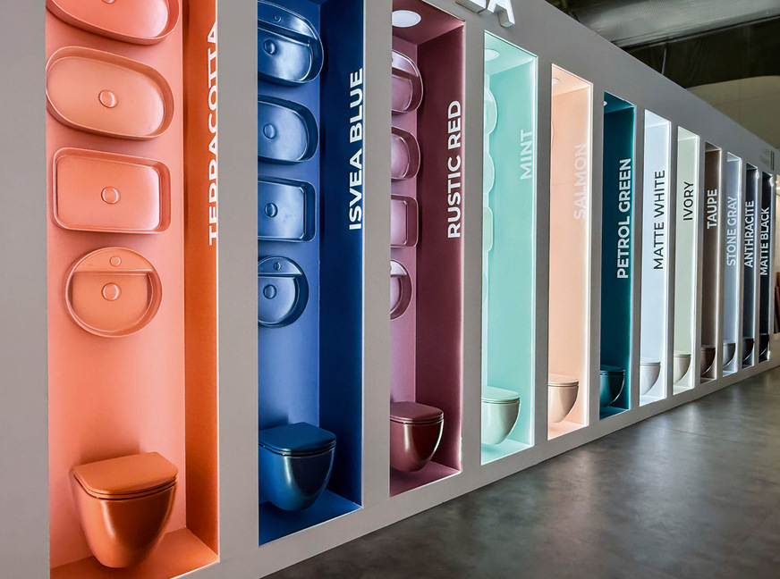 Eine völlig andere, aber nicht minder farbenreiche Geschichte erzählte man auf dem Stand von Isvea Bagno aus Italien. WCs, Waschbecken in vier Designs, Bidets und Urinale wurden außer in den unbunten Tönen Schwarz, Anthrazit, Steingrau, Nerz und Weiß auch in selbstbewusstem Terrakotta, Nachtblau, Burgund, Mint, Lachs und sogar in „Erdölgrün“ (!) präsentiert. Und zwar auf so großer Fläche, dass Colorisvea selbst bei einem schnellen Messerundgang im Stechschritt nicht zu übersehen war. Für deutsche Augen war es ein fast etwas provokantes Statement, das zum Nachdenken über die eigene Gestaltungsroutine einlud. Wer hier keine Akzentfarbe findet, mag wohl nicht gern farbig denken, oder?