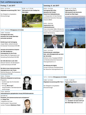 Auch das zweite große Thema wird im Rahmen des Verbandstages bzw. der begleitenden Fachtagung eine wichtige Rolle spielen: die Digitalisierung. Während Carsten Kuhlmann vom BDH den Fokus auf die Heizung legt („Die Heizung wird digital“) blickt Albrecht Oesterle in seinem Vortrag am Freitag auf den „SHK-Betrieb im Jahr 2030“. Inhaltlich abgerundet wird das Programm, neben der Delegiertenversammlung, von der öffentlichen Mitgliederversammlung am Freitagnachmittag, bei der der selbst ernannte Ermutiger und Überlebensberater Johannes Warth mit Wortwitz, Bildersprache und artistischen Aktionen brisante Themen ansprechen und Veränderungsprozesse anstoßen wird. Nicht zuletzt hat die SHK-Innung vor Ort in Überlingen für alle Mitgereisten ein tolles Rahmenprogramm organisiert – selbstverständlich mit einer Schifffahrt auf dem schönen Bodensee.