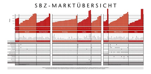 Die nebenstehende Farb- und Preisübersicht wurde anhand von vergleichbaren Standardkonfigurationen und den Endverbraucherpreislisten der Hersteller erstellt. Als Vergleichsbasis dient ein Warenkorb mit einem 70-cm-Waschtisch oder einem gleichwertigen Modell sowie einem wandhängenden WC und einem Bidet. Bei einem (geringen) Teil der Serien gibt es kein Bidet. In diesen Fällen, die in der Übersicht besonders gekennzeichnet sind, wurde entweder ein Bidet zugeordnet oder ein Urinal hinzugenommen. Die Preisangaben erfolgen ohne Mehrwertsteuer.